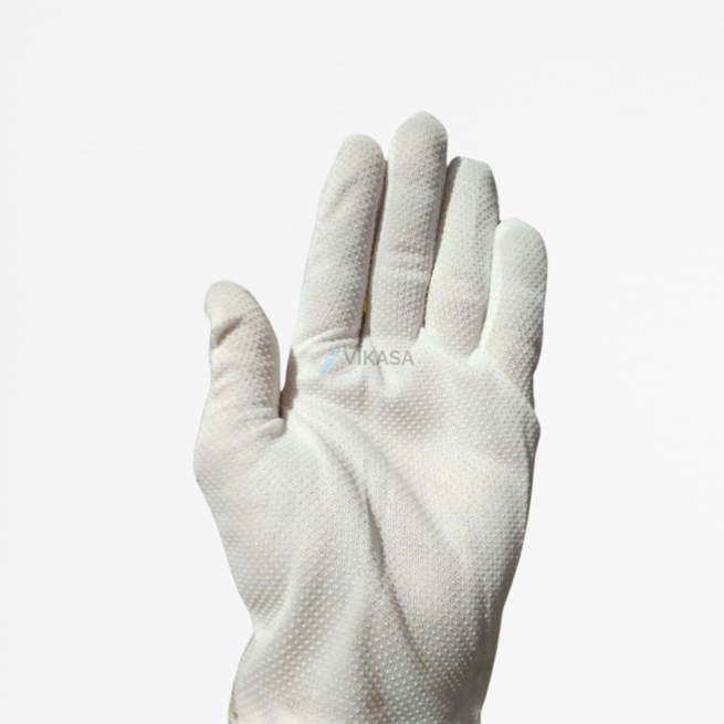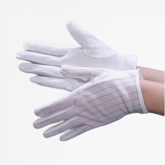 ESD dotted gloves (also called anti static dotted gloves) are made of special polyester material with conductive fiber at 10 mm spacing.